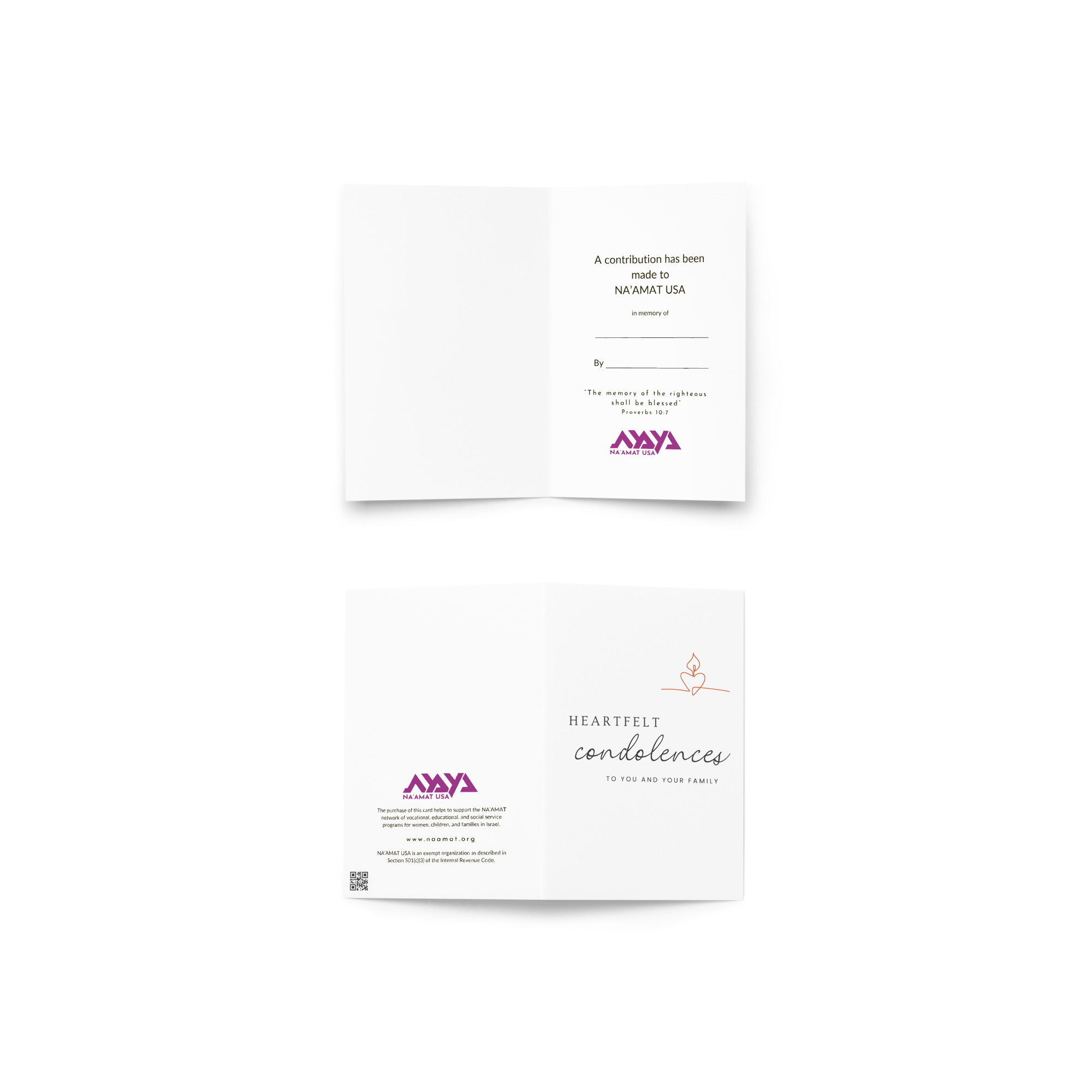 The card features the words: “A contribution has been made to NA’AMAT USA in memory of” with designated lines to personalize with the tribute name and your own name as the giver.